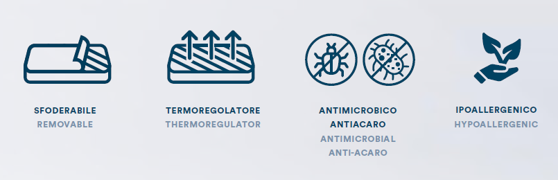 Sfoderabile su 4 lati in Cell Solution, l’innovativo tessuto che viene prodotto con fibre derivanti dalla polpa di eucalipto tencel e dalla tecnologia PCM che consiste in micro capsule di paraffina che sono in grado di assorbire il calore in eccesso. L’obbiettivo è quello di garantire un temperatura costante della persona che dorme.